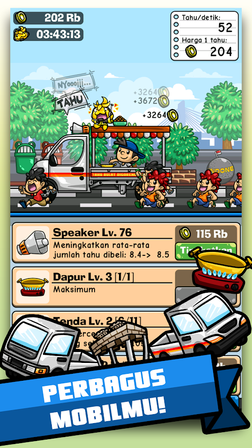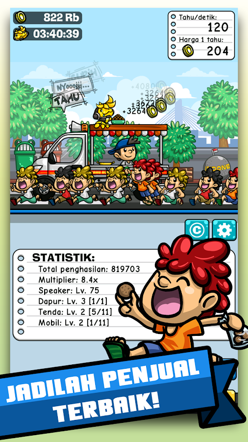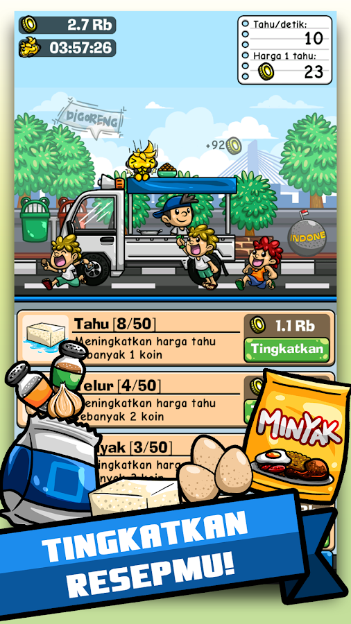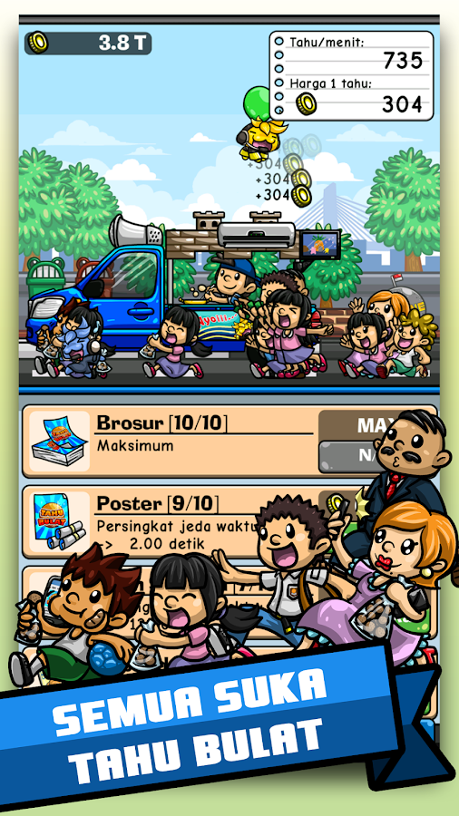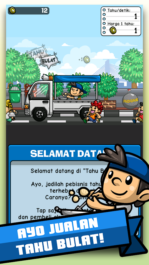 Tahu bulat, digoreng dadakan, lima ratusan, nyoooooy, nyoooooy, sebutkan gimana jingle si tahu bulat ini di daerahmu. Dan sekarang, Kepopuleran Tahu Bulat malah dimanfaatkan sebuah developer game Indonesia untuk membuat sebuah game sederhana. Di game ini kamu menjadi si penjual Tahu Bulat. Selama menjual tahu, kamu juga bisa mengupgrade mobil dan perkakas, serta mengupgrade resep agar selain pembeli lebih banyak datangnya, juga harga tahu kamu menjadi lebih mahal dan laris tentunya. Gimana keseruannya bisa kamu download langsung di link dibawah.